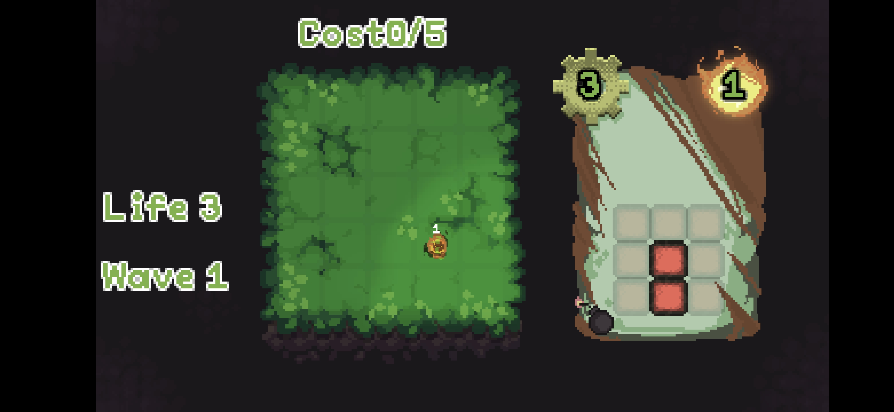 When the cost is completed or there are no enemies on the board, the game moves to the next wave, and a random card in the deck is upgraded. This can reduce the cost, increase the damage, or add a new cell to the pattern.
